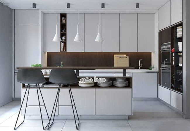 در دکوراسیون مینیمال، آشپزخانه باید ساده و منظم باشد. میتوانید از کابینت هایی با درب مگنتی (بدون دستگیره) استفاده کنید. به جای قرار دادن وسایل زیاد روی کابینت، تنها مواردی که به طور روزانه استفاده میشود را در معرض نمایش بگذارید. از کشو های مخفی و زیاد برای گذاشتن وسیله های آشپزخانه استفاده کنید تا وسایل اضافی در دید نباشند. رنگ های سفید یا طوسی برای آشپزخانه های مینیمال مناسباند. این رنگ ها برای ایجاد فضایی با رنگ بندی روشن و هماهنگ با سبک کلی دکوراسیون کمک میکنند.